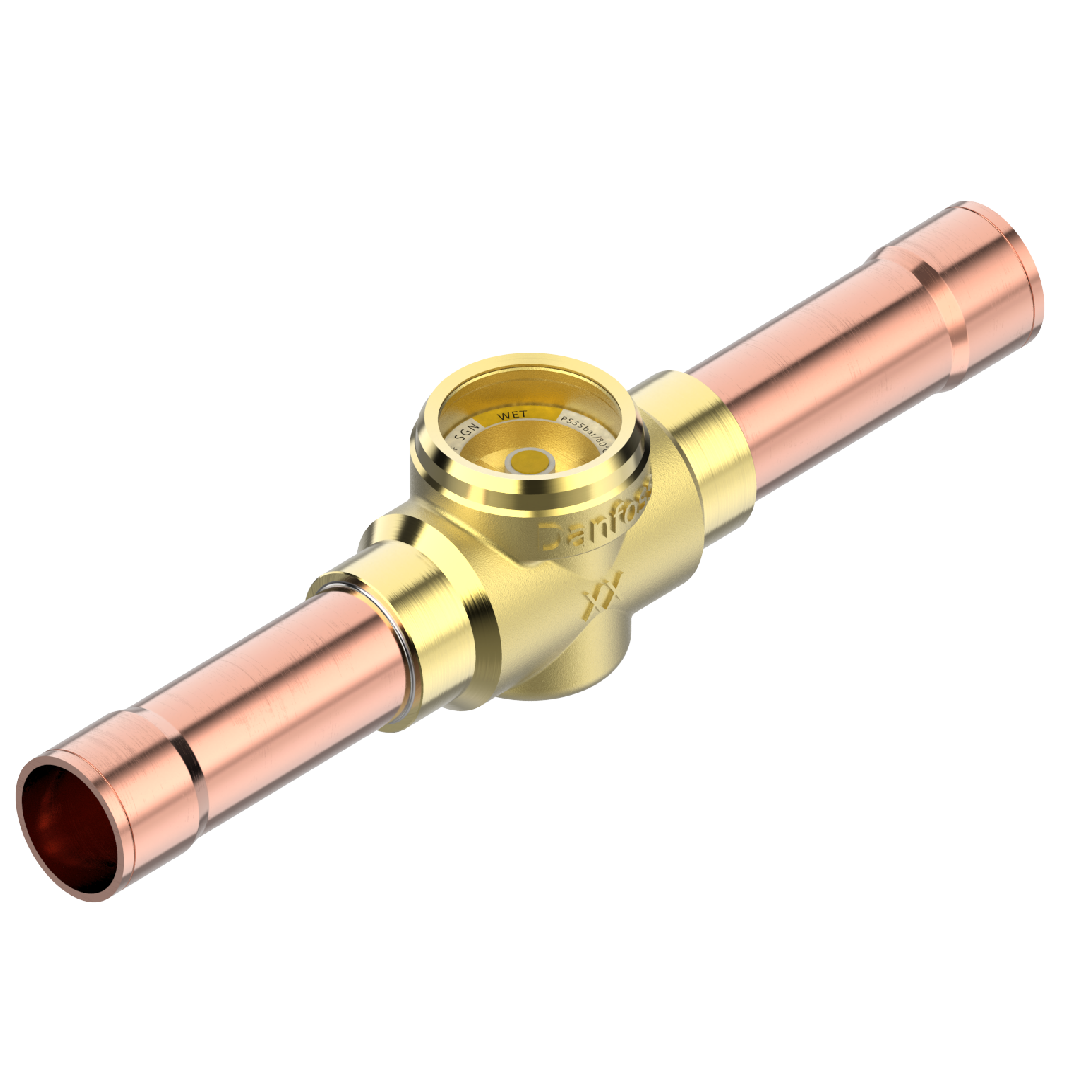 อุปกรณ์ป้องกันระบบทำความเย็น Sight glass ยี่ห้อ Danfoss ชนิด SG/SGP ติดตั้งอยู่หลังดรายเออร์กรองในท่อของเหลวของระบบทำความเย็น และในคอมเพรสเซอร์โดยใช้แบบเชื่อมต่อซ็อกเก็ต เพื่อสังเกตการเปลี่ยนแปลงสถานะของสารทำความเย็น (ของเหลว/ไอ) และเพื่อแสดงระดับความชื้นด้วยสี
